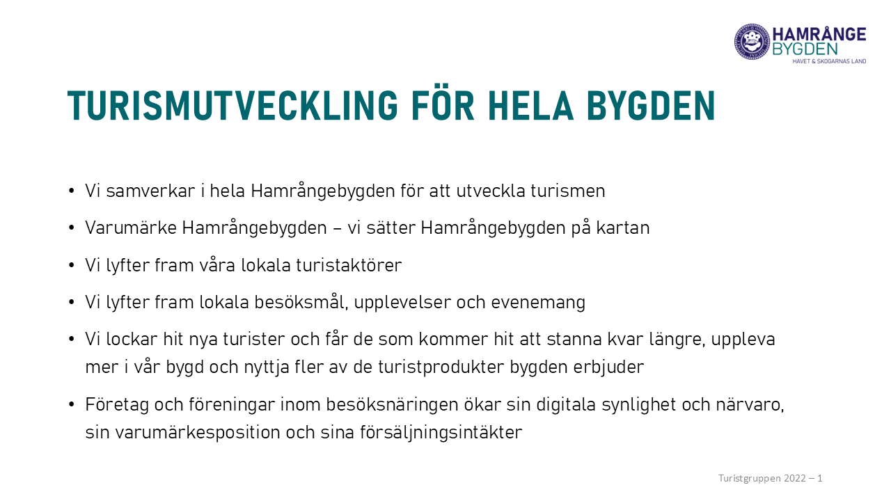 Turistgruppen är en arbetsgrupp under Hamrångegruppen som bildades 2018, i samband med arbetet med den lokala utvecklingsplanen (LUP). Gruppens mål är att driva de förslag och idéer gällande turism som ingår i den lokala utvecklingsplanen för Hamrångebygden.
